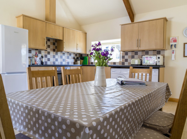 The cottage boasts a large lounge with picture window with views across the pond and a private decking area. A large well equipped and fully fitted kitchen designed for a self catering holiday includes a dishwasher, touch sensitive electric hob, microwave, fan oven, washing machine and large fridge/freezer and a table and chairs for 6 people but with ample space to add additional furniture for larger gatherings when groups rent all 3 cottages.